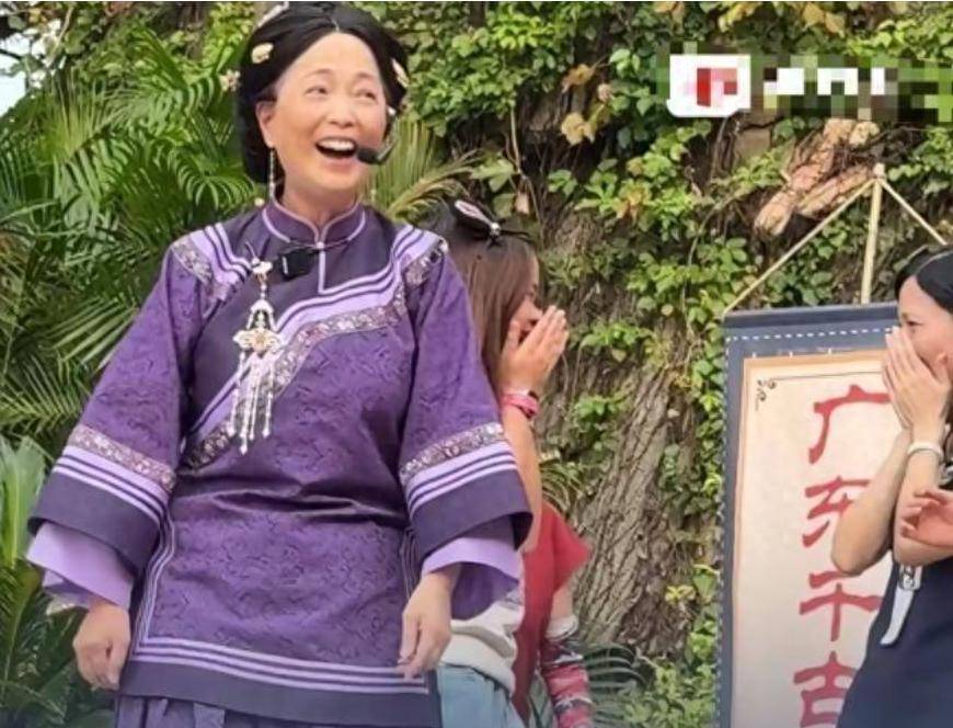 穿着紫色的古装,唱着粤语老歌。